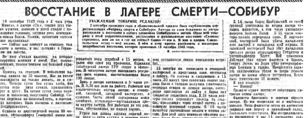 В этот день в 1943 году произошло восстание в лагере смерти Собибор. На свободу вырвались более 300 узников. Единственный успешный массовый побег из нацистского концлагеря организовал и возглавил советский офицер Александр Печерский. Его подвиг теперь увековечен художественным фильмом «Собибор».
