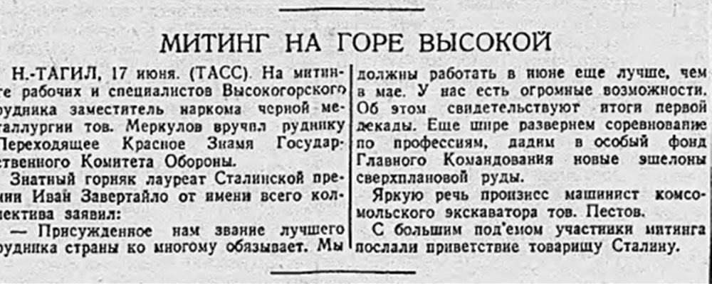 Постановлением ЦК ВКП(б) от 15 мая 1930 года «О работе Уралмета» Высокогорский рудник был определён в качестве главной сырьевой базы строившегося Новотагильского металлургического завода.