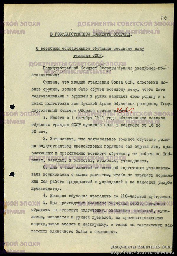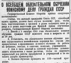 В целях подготовки для Красной Армии обученных резервов ГКО постановил ввести с 1 октября 1941 г. обязательное военное обучение граждан СССР мужского пола в возрасте от 16 до 50 лет. В первую очередь охватывались допризывники 1923 и 1924 гг. рождения и военнообязанные запаса (из числа необученных) в возрасте до 45 лет.