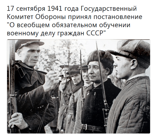 17 сентября 1941 г. И. В. Сталин подписал Постановление Государственного комитета обороны (ГКО) «О всеобщем обязательном обучении военному делу граждан СССР». В свете этого постановления во всех учебных заведениях Советского Союза вводился учебный предмет «военное дело».