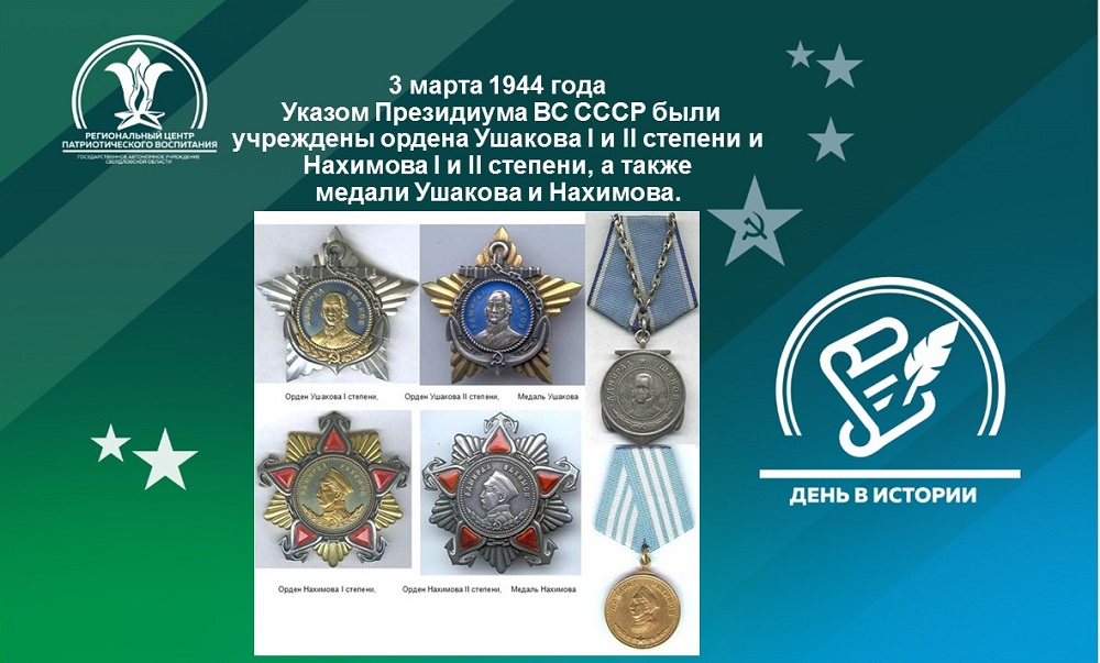 3 марта 1944 года Указом Президиума ВС СССР были учреждены два новых ордена: орден Ушакова I и II степени и орден Нахимова I и II степени и медали Ушакова и Нахимова
