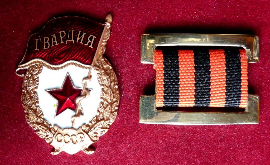 Указом Президиума Верховного Совета СССР от 21 мая 1942 года был учрежден нагрудный знак «Гвардия», а также гвардейская лента – золотисто-оранжевого цвета с нанесенными на ней тремя продольными черными полосами.