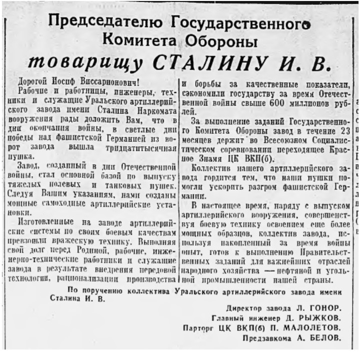 Это на его долю выпал тяжелейший период истории завода – годы Великой Отечественной войны. В этот период во всю разворачивалось нарастающими темпами производство 122-мм гаубиц М-30; на производство были поставлены разработанные ОКБ-9 орудия самоходных артиллерийских установок СУ-85, СУ-122, ИСУ-152, СУ-122 и СУ-100; 152-мм гаубица Д-1 образца 1943 года и 85-мм дивизионная пушка Д-44 образца 1944 года, а также пушки лучших танков Второй мировой войны: 85-мм пушка Д-5Т для танков Т-34-85 и ИС-1 и 122-мм пушка Д-25Т для танков ИС-2 и ИС-3.