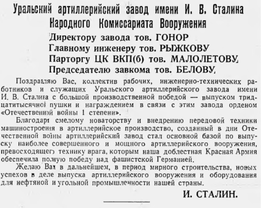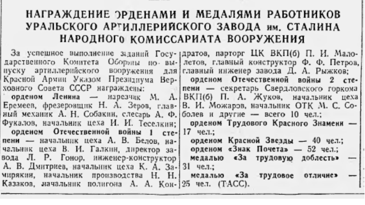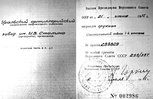21 июня 1945 года завод № 9 имени Сталина за успешное обеспечение армии артиллерийским вооружением награждён орденом Отечественной войны I степени