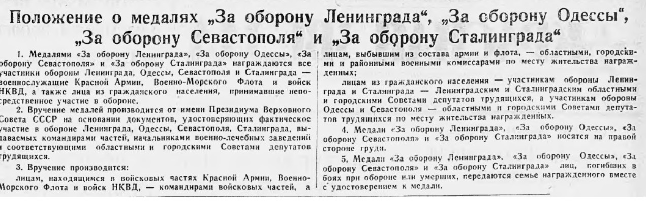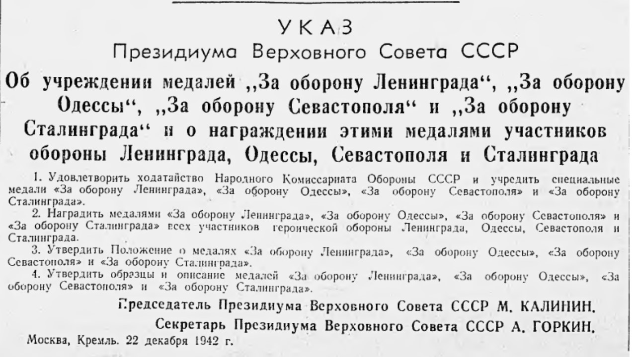 22 декабря 1942 года был опубликован Указ Президиума Верховного Совета СССР «Об учреждении медалей “За оборону Ленинграда”, “За оборону Одессы”, “За оборону Севастополя” и “За оборону Сталинграда” и о награждении этими медалями участников обороны Ленинграда, Одессы, Севастополя и Сталинграда».