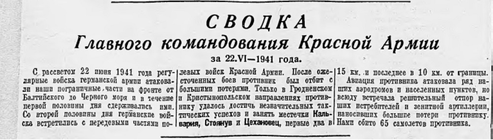 Первый вражеский бомбардировщик был сбит в 3:30 в Белоруссии пилотами 33-го истребительного авиационного полка.