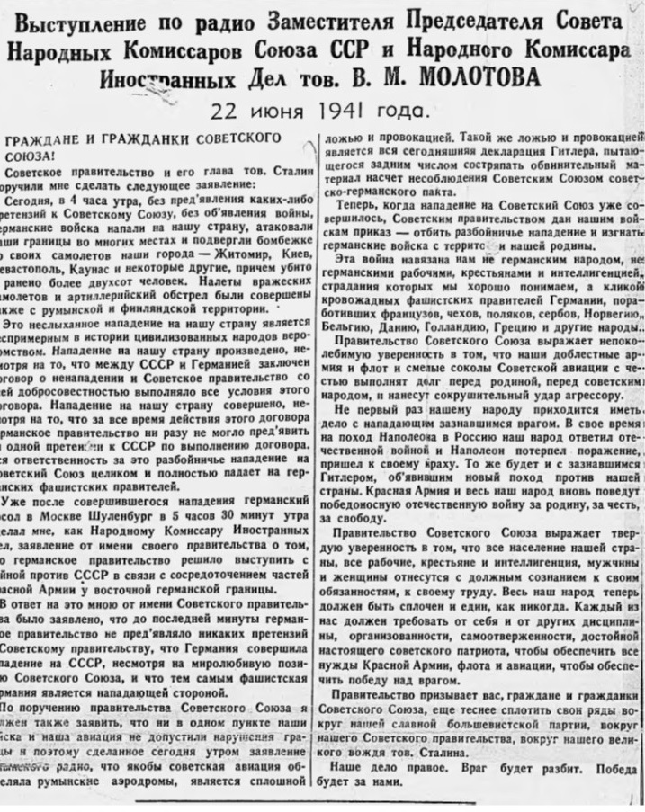 Против СССР выступили вместе с Германией Румыния, Италия, через несколько дней Словакия, Финляндия, Венгрия, а в середине августа к ним присоединилась Норвегия. Советский народ ответил врагу единым могучим сопротивлением, стоял в полном смысле этого слова насмерть, защищая отечество.