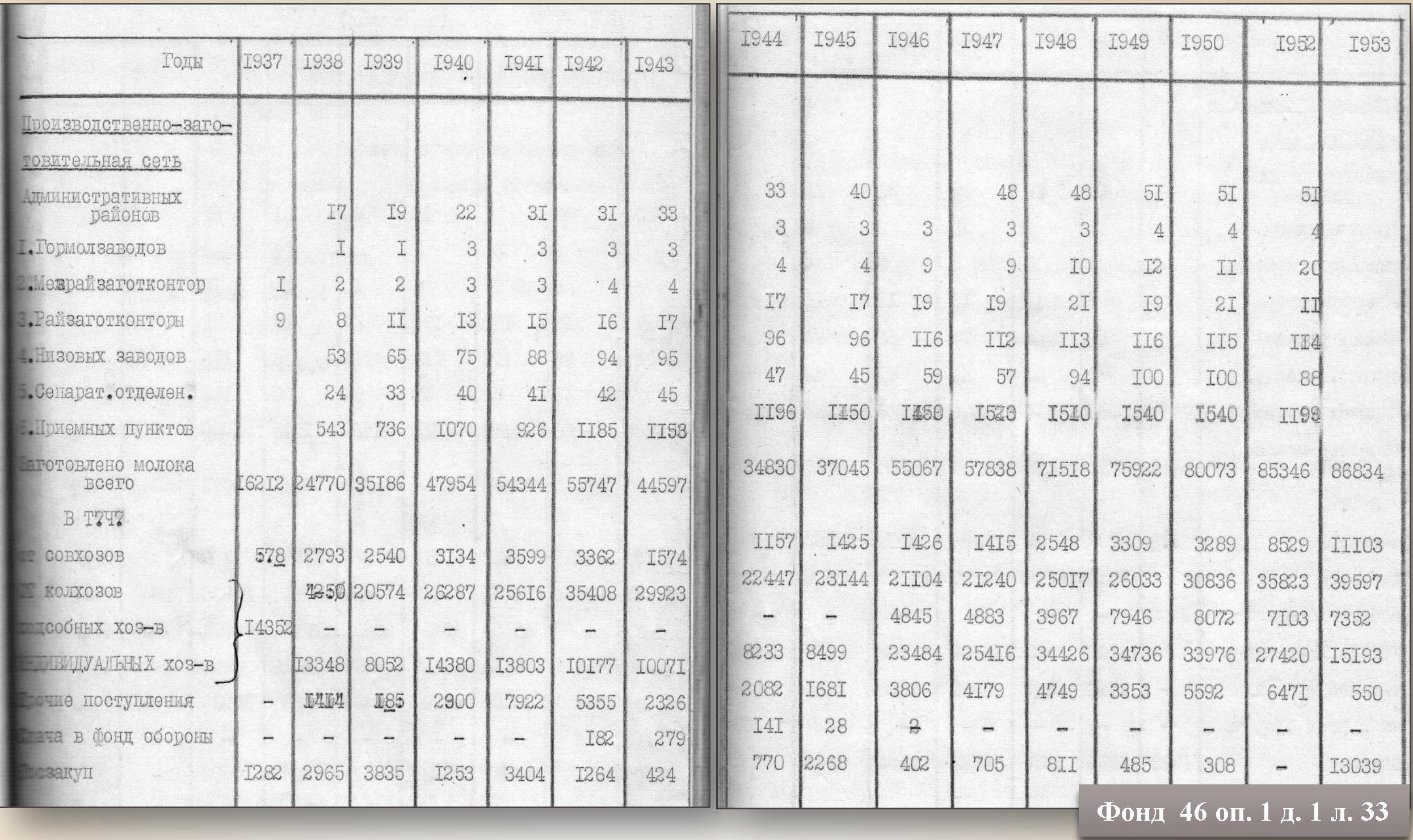 В 1941 году по зоне комбината было заготовлено 54344 тонны молока, а в 1944 году только 34790 тонн, несмотря на то, что в 1942 году зона комбината расширилась за счет Каменского и Покровского районов Челябинской области. (Отдел по делам архивов, ф. 46 оп. 1 д. 1 л. 19-20).