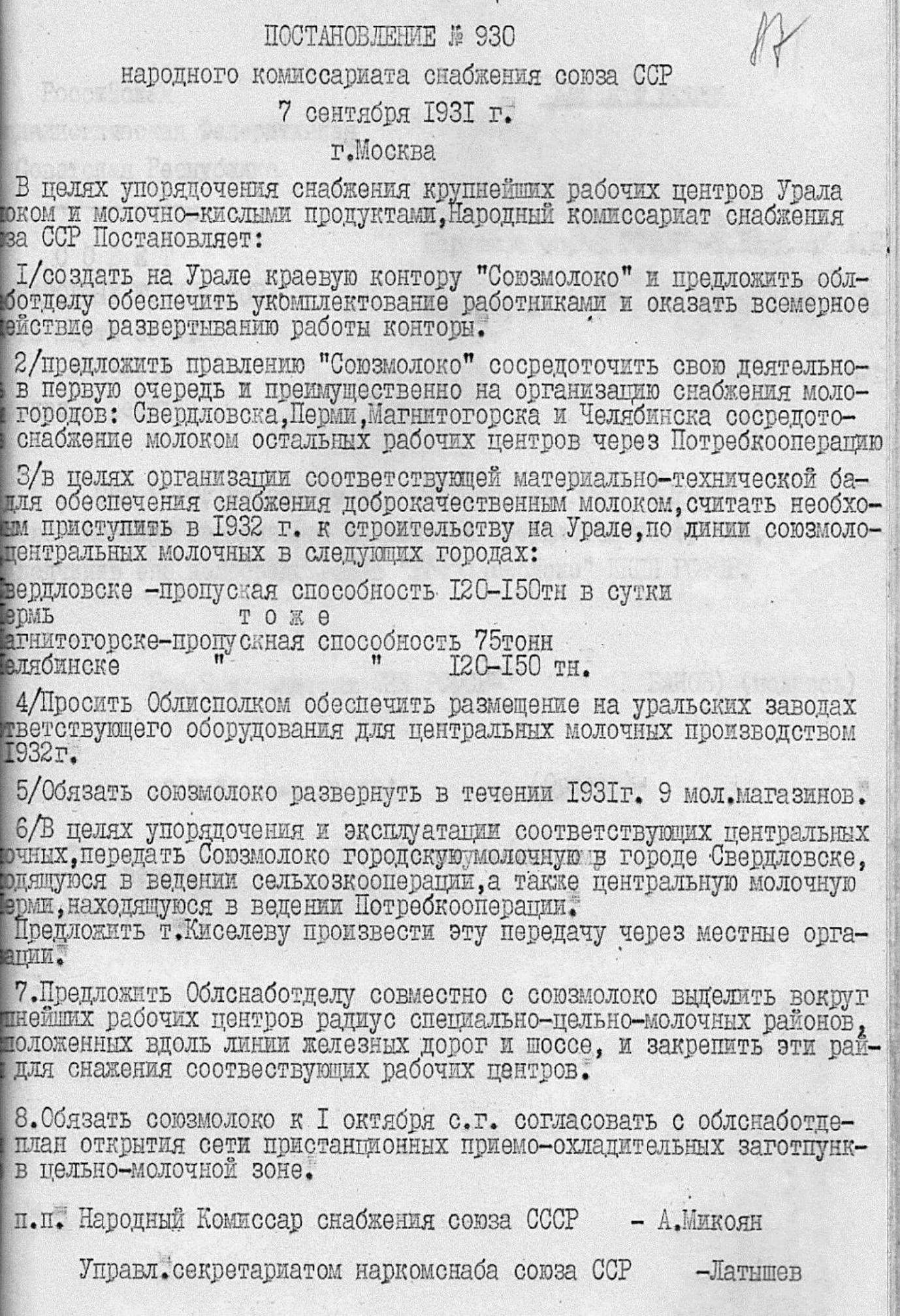Свердловский трест «Росглавмолоко» во исполнение Приказов Главка от 2 марта 1936 года № 72 и от 1 апреля 1936 года № 113 закрепил за Свердловским молочным заводом районы, завозящие цельное молоко и молочно-кислые продукты (Свердловский, Полевской, Первоуральский, Сухоложский, Режевской, Ирбитский, Егоршинский, Артинский, Красноуфимский), с годовым планом заготовок молока на 1936 год в пересчете на молоко 20672 тонн. (Отдел по делам архивов, ф. 46 оп. 1 д. 1 л. 9).