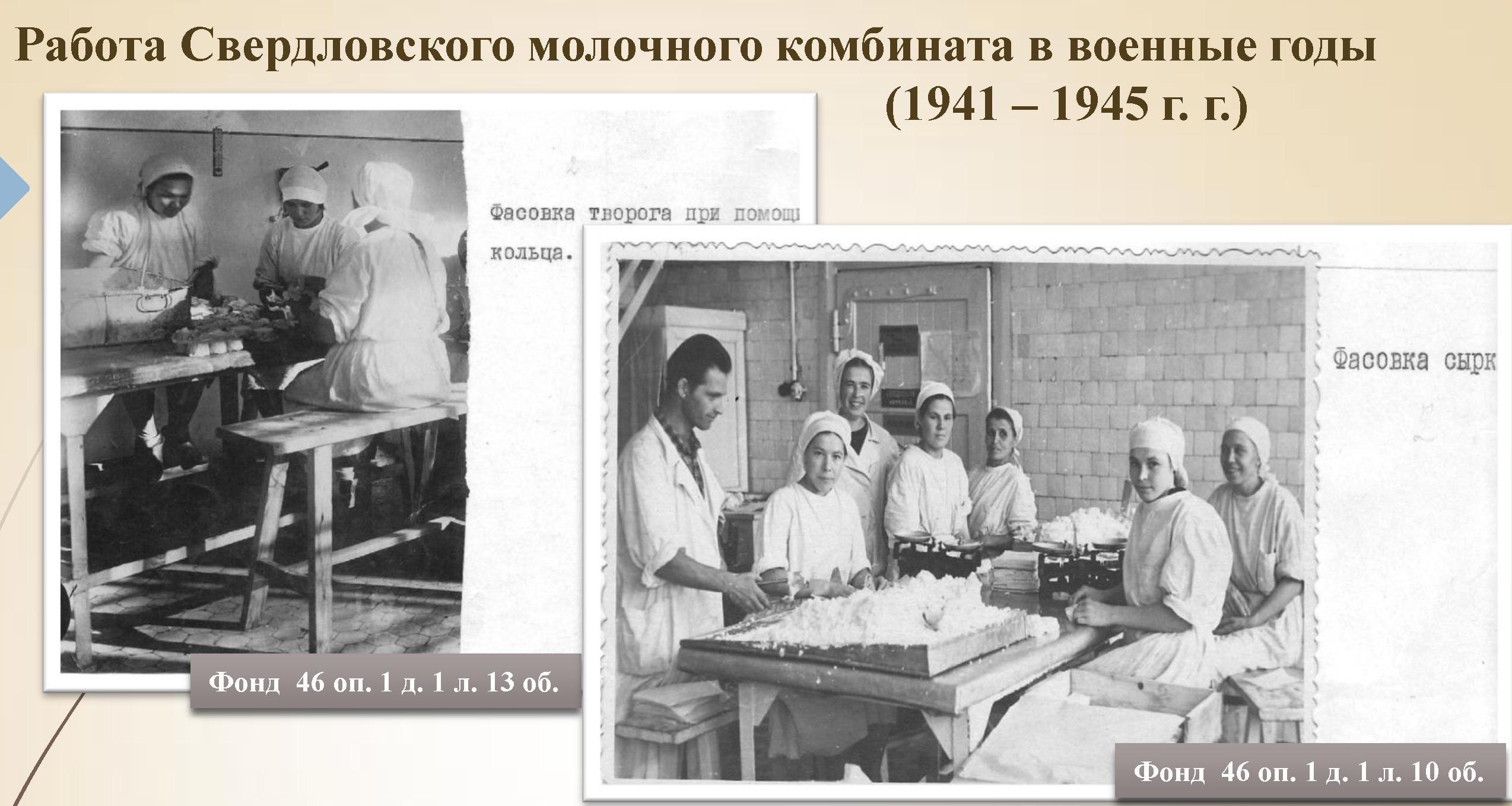 В годы Великой Отечественной войны, вырабатываемые молочным комбинатом продукты в первую очередь направлялись в детские учреждения (интернаты, детские ясли и детские сады) и в госпитали, в том числе в 23 госпиталя г. Свердловска. В лаборатории молочного комбината в особо стерильных условиях вырабатывалась ацидофильная паста, которая использовалась для лечения гнойных ран, а также желудков раненных бойцов. (Отдел по делам архивов, ф. 46 оп. 1 д. 1 л. 23-24).