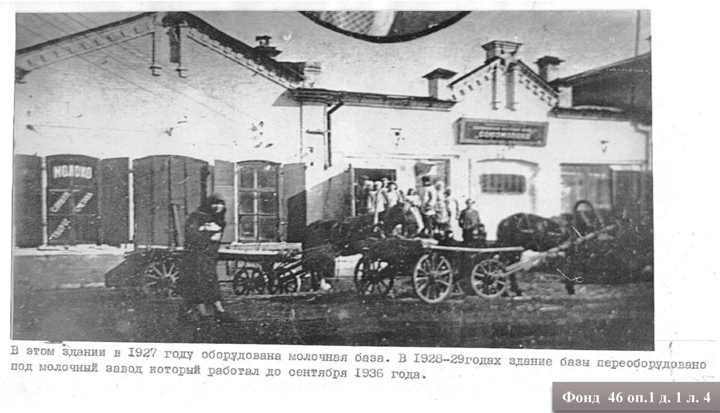 В конце 1928 года в здании, занимаемом базой по приемке молока, было установлено оборудование: парокотел, сепаратор, насос для перекачивания молока, мешалочный пастеризатор, ручная мороженица, деревянные чаны для нормализации сметаны и выработки творога и другое оборудование. На территории базы заготавливался лед, на втором этаже здания была оборудована лаборатория. В первые годы выпускалось в сутки 200 литров молока во флягах, 100 литров – в бутылках, простокваша в фарфоровых кружках – до 100 кружек, кефира до 400 бутылок в сутки. Мороженного вырабатывалось до 60 кг в сутки, сырков творожных до 30 ящиков, весового творога – 100 кг. Рабочий день был ненормированным, работали столько, сколько требовалось для переработки поступившего молока. (Отдел по делам архивов, ф. 46 оп. 1 д. 1 л. 5).