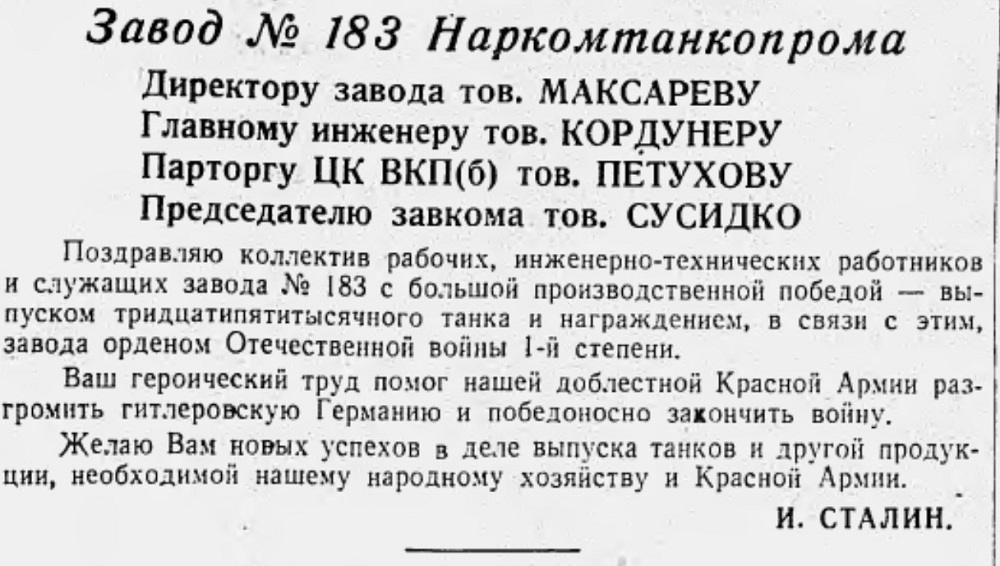 Юбилейный, 35-тысячный танк сошел с конвейера завода уже после войны, 25 мая 1945 года, а 27 мая прошел тожественный митинг, посвященный выпуску 35-тысячного танка и награждению завода орденом Отечественной войны I степени.