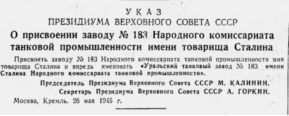 На их базе был создан Уральский танковый завод №183 имени Коминтерна. Он подчинялся Наркомату танковой промышленности, созданному в сентябре 1941 года Указом Президиума Верховного Совета СССР. На Уральский танковый завод было привезено и установлено более 3 тыс. единиц оборудования. В кратчайшие сроки, всего за два месяца, производственные мощности нижнетагильского предприятия были полностью перепрофилированы на выпуск танков.