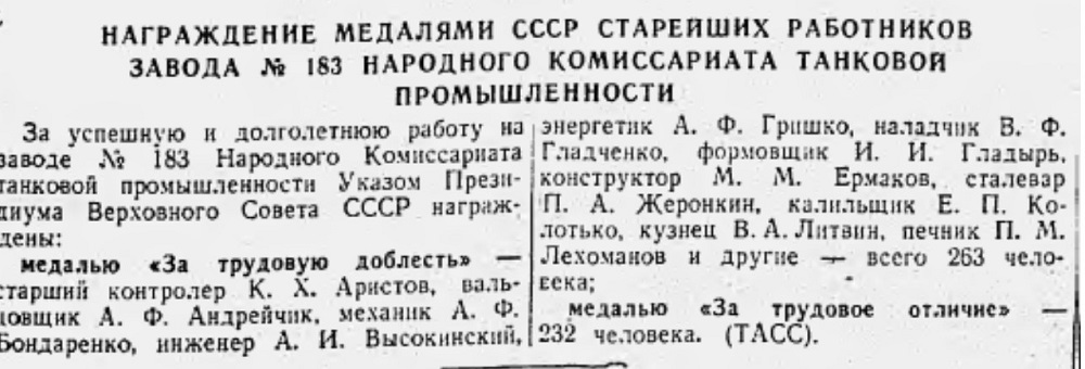На предприятии активно развивалось стахановское и рационализаторское движение. Люди часто сутками не уходили с предприятия. Только в 1943 году насчитывалось 300 рабочих смен. Если срывался график выпуска танков, применялись чрезвычайные меры: весь командный состав, необходимую часть рабочих, ИТР и служащих переводили на казарменное положение. Выход за пределы завода разрешался только по специальным запискам на определенное время. Казарменное положение снималось только с тех, кто обеспечивал выпуск продукции по установленному суточному графику.
