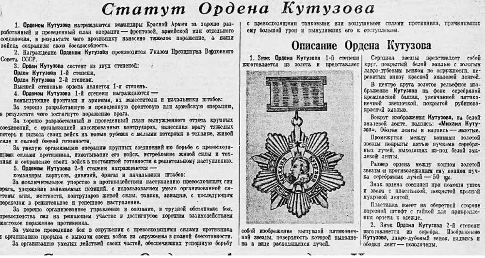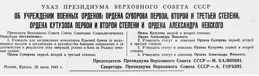 В этот день в 1942 году учреждены первые полководческие ордена для награждения отличившихся командиров: орден Суворова, орден Кутузова и орден Александра Невского.