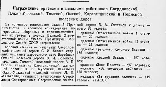 По итогам работы за 1943 г. А.К. Черепанов и М.А. Казанцев были удостоены звания Герой Социалистического труда – первые на Свердловской магистрали.