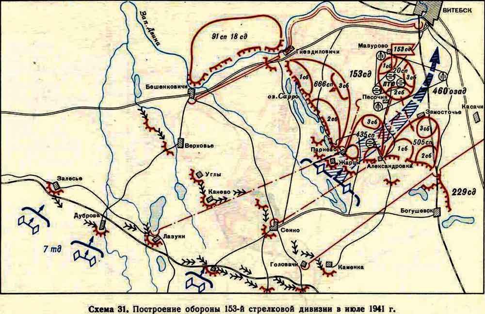 5 июля 1941 года передовые отряды на этих рубежах вступили в бой с крупными моторизованными силами противника, прорывающегося к Витебску.