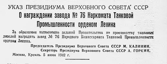 За героический труд по выполнению заданий правительства завод №76 был награжден орденом Ленина (1942) и орденом Трудового Красного Знамени (1943). Директору завода Д.Е. Кочеткову было присвоено звание Героя Социалистического Труда (1943). Большой состав специалистов завода был награжден орденами и медалями, в том числе главный конструктор по двигателестроению Чупахин Т.П. Уральский турбинный завод им. С.М. Кирова в годы войны оставался единственным в СССР турбостроительным заводом, обеспечивающим действующие электростанции запасными частями, от его работы зависела энергетическая безопасность, укрепление военной мощи страны.