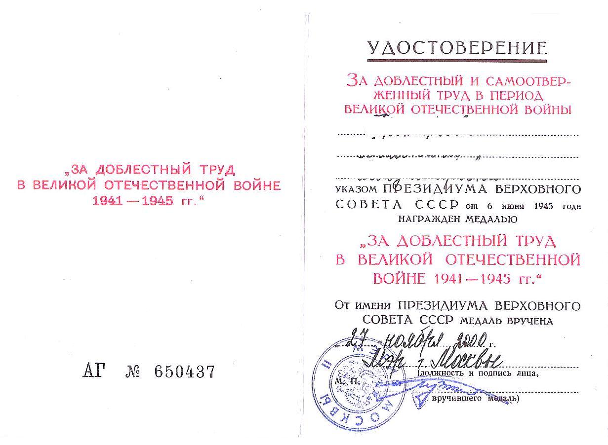 С 5 февраля 1951 года по указу Президиума Верховного Совета СССР в случае смерти награжденного медаль «За доблестный труд в Великой Отечественной войне 1941–1945 годов» и удостоверение к ней остаются в его семье для хранения как память.