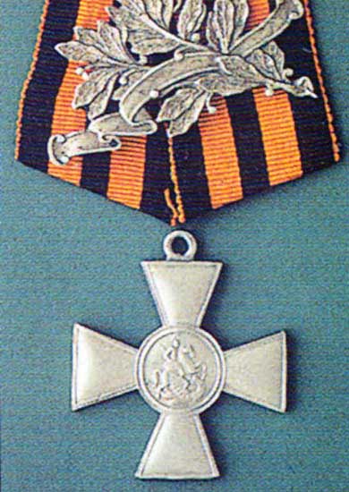 В 1807 г. был учрежден знак отличия ордена Св. Георгия для награждения солдат и матросов. Эта награда представляла собой серебряный крест без эмали, носили его также на георгиевской черно-желтой ленте на груди. Уже в Первых правилах, касающихся знака отличия, указывалось: «Он приобретается только в поле сражения, при обороне крепостей и в битвах морских. Им награждаются только те из нижних воинских чинов, которые, служа в сухопутных и морских русских войсках, действительно выкажут свою отменную храбрость в борьбе с неприятелем».