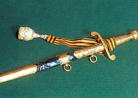 В 1775 г., при праздновании годовщины мира с Турцией после войны 1768 – 1774 гг., 11 самых выдающихся военачальников русской армии, в их числе и генерал-поручик А.В. Суворов, были награждены золотыми шпагами с бриллиантами. Позже великий русский полководец еще раз был награжден золотой, с драгоценными украшениями шпагой за победу при Рымнике в 1789 г.