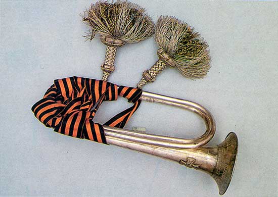 В русской армии был еще один вид коллективной боевой награды – Георгиевские серебряные трубы (в кавалерии – сигнальные рожки) с прикрепленными к ним серебряными Георгиевскими крестами и черно оранжевыми лентами.