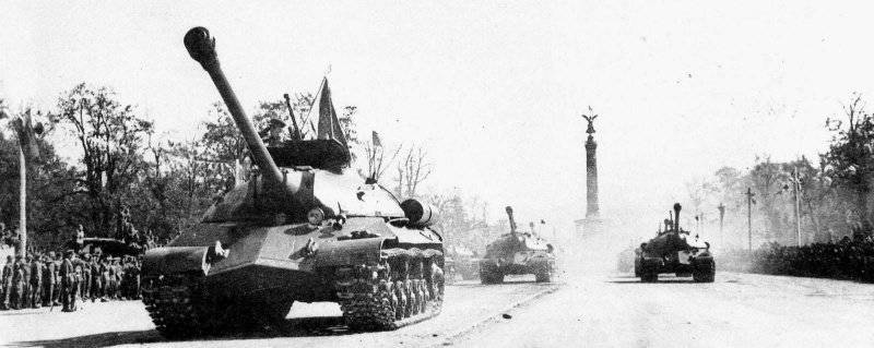 Однако всё это померкло на фоне, завершающей парад, советской военной техники. Всеобщим восхищением сопровождалось 52 тяжёлых танка ИС-3, получивших своё название в честь Иосифа Сталина, разработанных по проекту ведущего советского конструктора М.Ф. Балжи, 2-й гвардейской танковой армии, под командованием генерал-майора танковых войск, Героя Советского Союза Т.П. Абрамова.