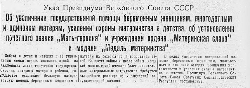 «Мать-героиня» - высшее звание, присваиваемое многодетным матерям, и название одноимённого ордена в СССР. Звание и орден учреждены Указом Президиума Верховного Совета СССР 8 июля 1944 года.