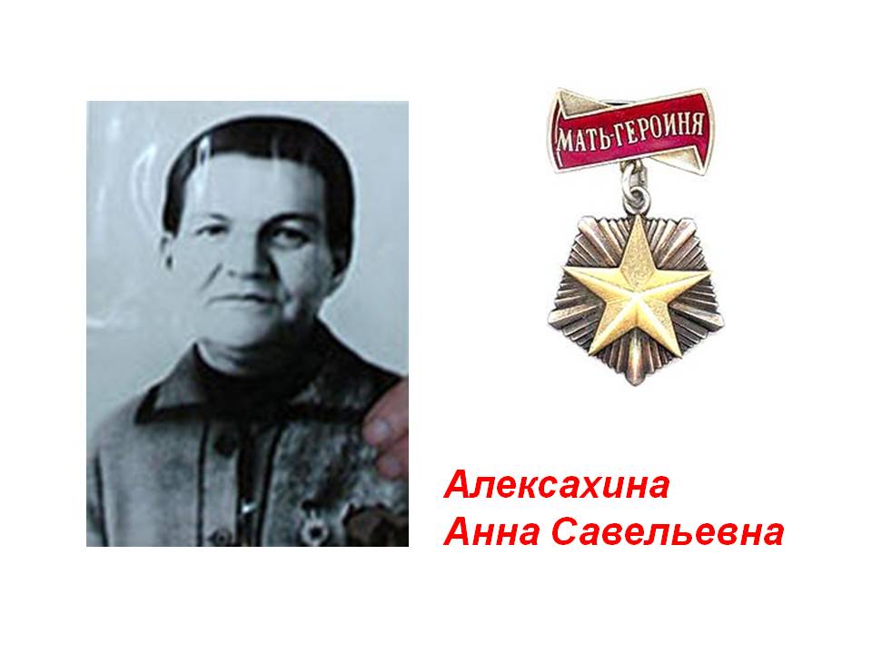 Первое присвоение почетного звания «Мать-героиня» было произведено Указом Президиума Верховного Совета СССР от 27 октября 1944 года. Среди четырнадцати женщин, удостоенных этим Указом звания, орден «Мать-героиня» № 1 и Грамота Президиума ВС СССР № 1 были вручены Алексахиной Анне Савельевне, воспитавшей 12 детей (десять сыновей и двух дочерей). Награда была вручена ей в Кремле 1 ноября 1944 года из рук Михаила Калинина.