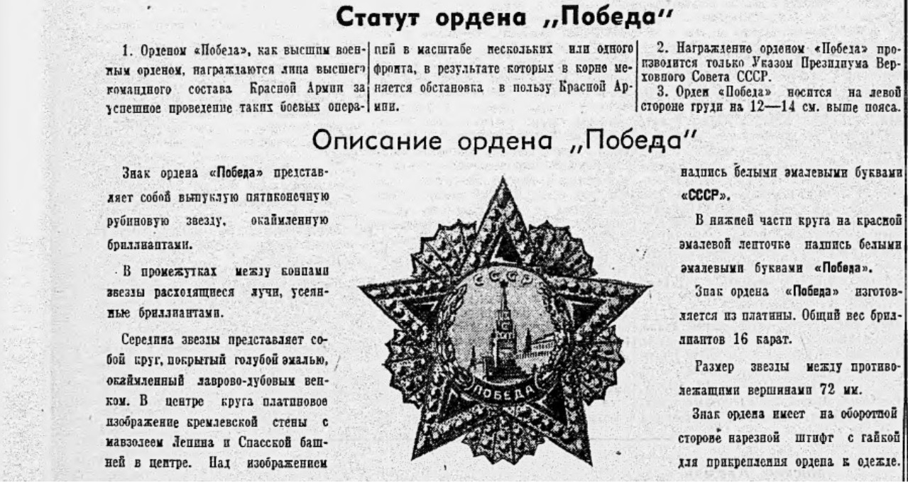 Указом Президиума Верховного Совета СССР учрежден высший военный орден – орден «Победа» (автор-художник А.И. Кузнецов).