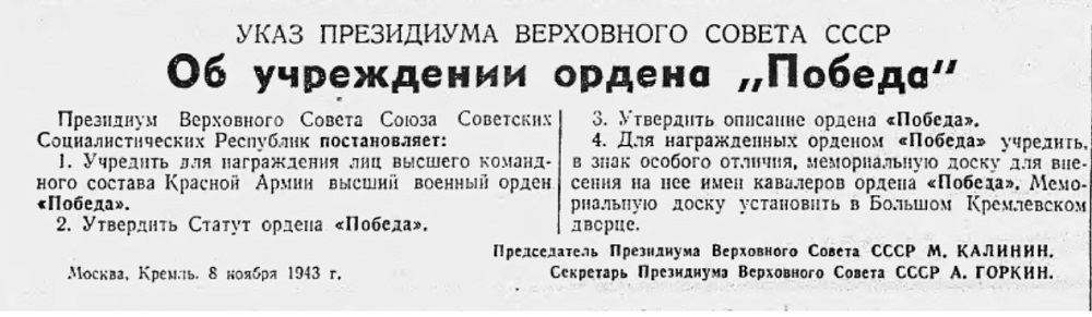 Орден «Победа» за № 1 был вручен Маршалу Советского Союза Г.К. Жукову. Три человека – И.В. Сталин, Г.К. Жуков и А.М. Василевский – были награждены орденом дважды.