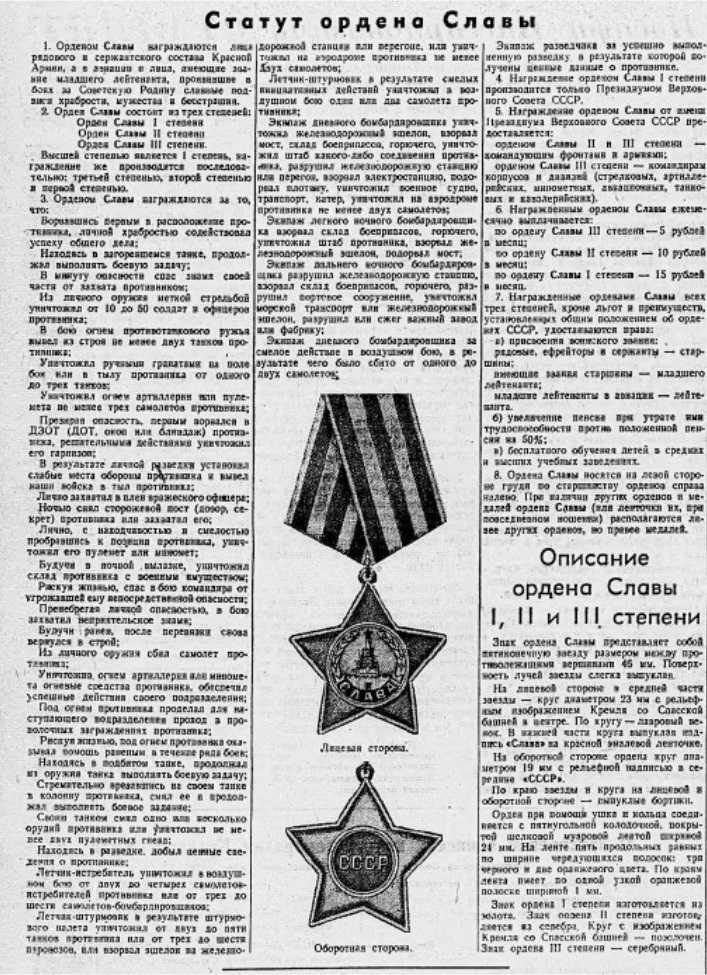Орден Славы - единственная советская награда, выдававшаяся исключительно за личные заслуги: орден никогда не присваивался ни воинским частям, ни предприятиям, как это бывало, например, с орденом Ленина.