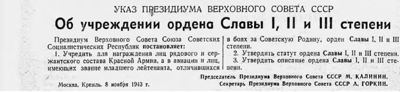 Первыми обладателями Ордена Славы I степени стали сапёр-ефрейтор М.Т. Питеник и помощник комвзвода ст. сержант К.К. Шевченко.