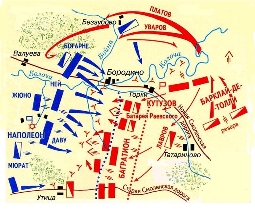 Расположение русских войск. Правый фланг занимали боевые порядки 1-й Западной армии генерала М.Б. Барклая-де-Толли, на левом фланге стояли части 2-й Западной армии под командованием П.И. Багратиона, а Старую Смоленскую дорогу у деревни Утица прикрывал 3-й пехотный корпус генерал-лейтенанта Н.А. Тучкова. Русские войска занимали оборонительное положение и были развернуты в форме буквы «Г». Такое положение объяснялось тем, что русское командование стремилось контролировать ведущие к Москве Старую и Новую Смоленские дороги, тем более что возникло серьезное опасение обходного движения противника справа. Вот почему на этом направлении оказалась значительная часть корпусов 1-й армии. Наполеон же решил нанести свой главный удар по левому флангу русской армии, для чего ночью 26 августа (7 сентября) 1812 г. перевел основные силы через р. Колочу, оставив для прикрытия собственного левого фланга лишь несколько кавалерийских и пехотных частей.