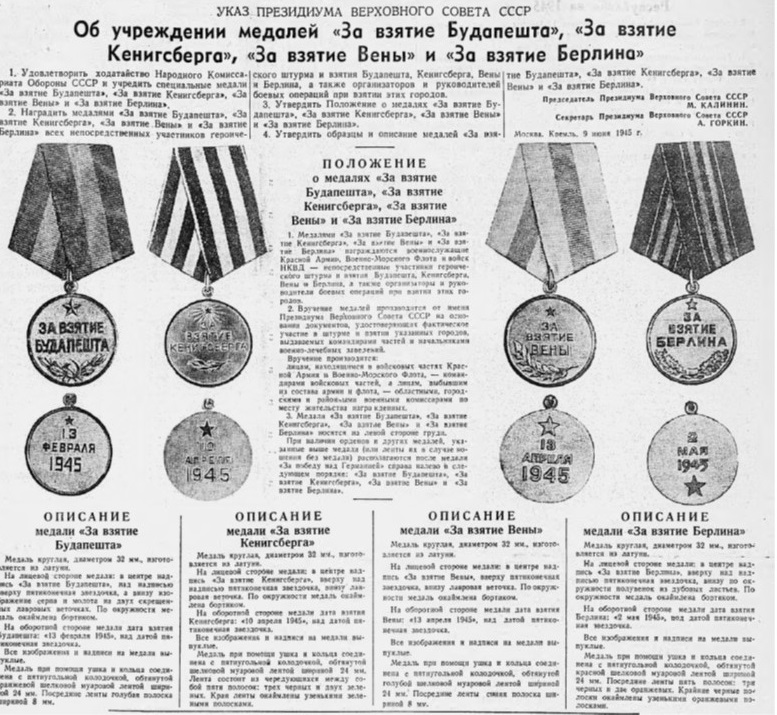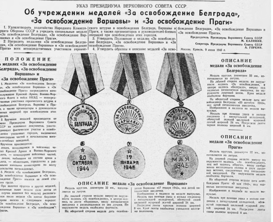 Летом 1945 года в СССР появились боевые медали, которые выдавались за взятие и освобождение основных европейских городов. Всего в советской наградной системе было семь таких медалей: «За взятие Вены», «За взятие Будапешта», «За взятие Кенигсберга», «За взятие Берлина», «За освобождение Варшавы», «За освобождение Праги» и «За освобождение Белграда». Как видим, 6 из 7 медалей были связаны с освобождением от фашизма европейских столиц. Все медали были учреждены на основании Указа Президиума ВС СССР от 9 июня 1945 года.
