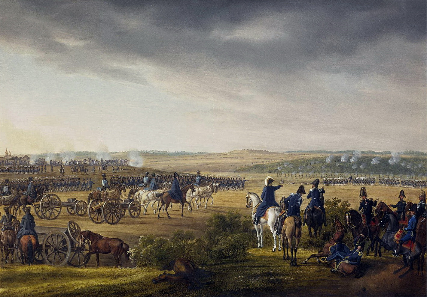 Итоги сражения. Французы смогли достичь тактических успехов на всех основных направлениях – русские армии были вынуждены оставить первоначальные позиции и отступить примерно на 1 км. Но прорвать оборону русских войск наполеоновским частям так и не удалось. Поредевшие русские полки стояли насмерть, готовые отразить новые атаки. Наполеон же, несмотря на настоятельные просьбы своих маршалов, так и не рискнул бросить для завершающего удара свой последний резерв – двадцатитысячную Старую гвардию. Интенсивная артиллерийская перестрелка велась до самого вечера, а потом французские части были отведены на исходные рубежи. Победить русскую армию не удалось. Вот, что писал отечественный историк Е.В. Тарле: «Чувство победы решительно никем не ощущалось. Маршалы разговаривали между собой и были недовольны. Мюрат говорил, что он не узнавал весь день императора, Ней говорил, что император забыл свое ремесло. С обеих сторон до вечера гремела артиллерия и продолжалось кровопролитие, но русские не думали не только бежать, но и отступать. Уже сильно темнело. Пошел мелкий дождь. «Что русские?» – спросил Наполеон. – «Стоят на месте, ваше величество». – «Усильте огонь, им, значит, еще хочется, – распорядился император. – Дайте им еще!»