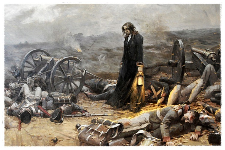 Угрюмый, ни с кем не разговаривая, сопровождаемый свитой и генералами, не смевшими прерывать его молчания, Наполеон объезжал вечером поле битвы, глядя воспаленными глазами на бесконечные груды трупов. Император еще не знал вечером, что русские потеряли из своих 112 тысяч не 30 тысяч, а около 58 тысяч человек; он не знал еще и того, что и сам он потерял больше 50 тысяч из 130 тысяч, которые привел к Бородинскому полю. Но что у него убито и тяжко ранено 47 (не 43, как пишут иногда, а 47) лучших его генералов, это он узнал уже вечером. Французские и русские трупы так густо устилали землю, что императорская лошадь должна была искать места, куда бы опустить копыто меж горами тел людей и лошадей. Стоны и вопли раненых неслись со всех концов поля. Русские раненые поразили свиту: «Они не испускали ни одного стона, – пишет один из свиты, граф Сегюр, – может быть, вдали от своих они меньше рассчитывали на милосердие. Но истинно то, что они казались более твердыми в перенесении боли, чем французы».