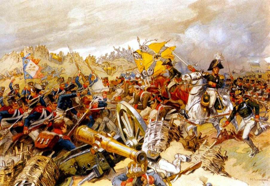 Борьба за батарею Раевского. После захвата флешей основная борьба развернулась за центр русской позиции – батарею Раевского, которая в 9 и 11 часов утра подверглась двум сильным атакам противника. Во время второй атаки войскам Э. Богарне удалось овладеть высотой, но вскоре французы были выбиты оттуда в результате успешной контратаки нескольких русских батальонов, возглавляемых генерал-майором А.П. Ермоловым.