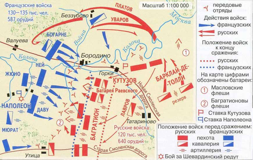 Русские войска занимали оборонительное положение и были развернуты в форме буквы «Г». Такое положение объяснялось тем, что русское командование стремилось контролировать ведущие к Москве Старую и Новую Смоленские дороги, тем более что возникло серьезное опасение обходного движения противника справа. Вот почему на этом направлении оказалась значительная часть корпусов 1-й армии. Наполеон же решил нанести свой главный удар по левому флангу русской армии, для чего ночью 26 августа (7 сентября) 1812 г. перевел основные силы через р. Колочу, оставив для прикрытия собственного левого фланга лишь несколько кавалерийских и пехотных частей.