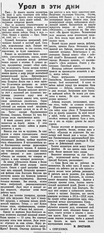 Заводы получают от фронтовиков письма - короткие, боевые, полные веры в победу. «Уральцы не подкачают. Мы выполним свой боевой долг с честью Рабочим Уралвагонзавода красноармейский привет», — пишет младший политрук Н. Турлаков из Действующей армии.