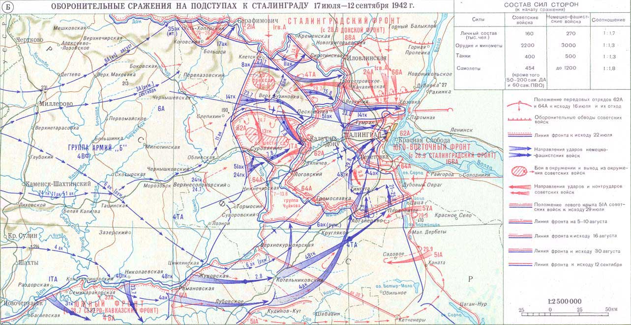 Немецкое командование наносило главный удар силами 6-й армии в направлении на Сталинград по кратчайшему пути через большую излучину Дона с запада и юго-запада, как раз в полосах обороны 62-й (командующий – генерал-майор В.Я. Колпакчи, с 3 августа – генерал-лейтенант А.И. Лопатин, с 6 сентября – генерал-майор Н.И. Крылов, с 10 сентября – генерал-лейтенант В.И. Чуйков) и 64-й (командующий – генерал-лейтенант В.И. Чуйков, с 4 августа – генерал-лейтенант М.С. Шумилов) армий. Оперативная инициатива находилась в руках немецкого командования при почти двойном превосходстве в силах и средствах.