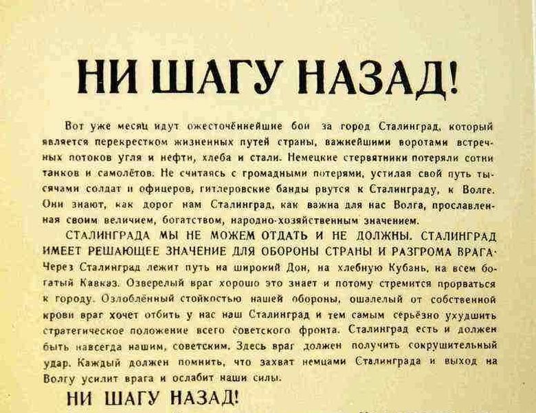 Отныне железным законом дисциплины для каждого командира, красноармейца, политработника должно являться требование – НИ ШАГУ НАЗАД БЕЗ ПРИКАЗА высшего командования...