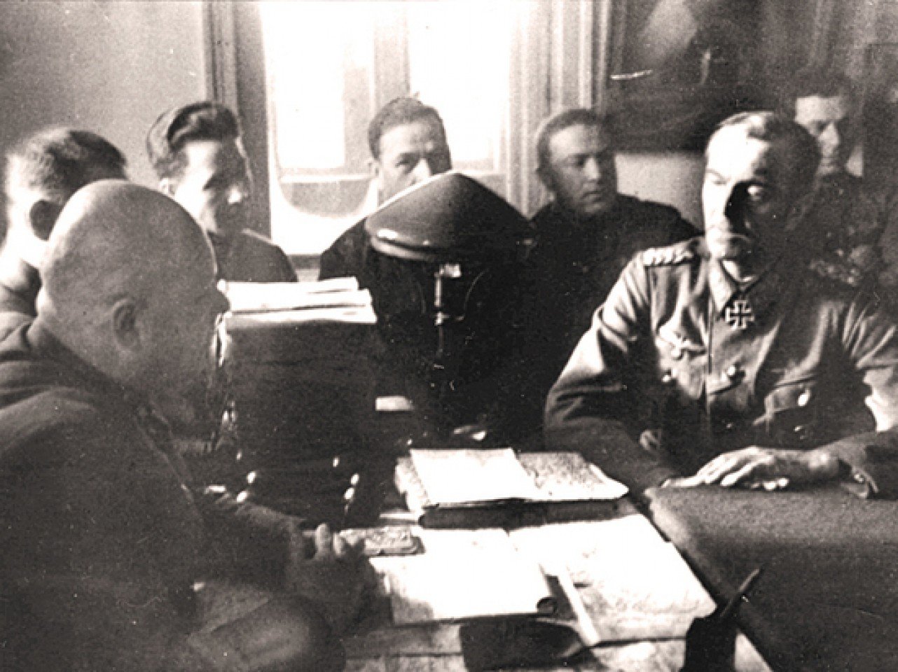 Вот как видел картину этих ожесточенных наступательных боев немецкий офицер, командир батальона: «...На русские позиции обрушивается залп за залпом. Там уже не должно быть ничего живого. Беспрерывно бьют тяжелые орудия. Навстречу первым лучам восходящего солнца в просветленном небе несутся бомбардировщики с черными крестами... Они пикируют и с воем сбрасывают на цель свой бомбовый груз... Еще каких-нибудь 20 метров, и они (немецкая пехота) уже займут передовые русские позиции! И вдруг они залегают под ураганным огнем. Слева короткими очередями бьют пулеметы. В воронках и на огневых точках появляется русская пехота, которую мы уже считали уничтоженной. Нам видны каски русских солдат. Каждое мгновение мы видим, как валятся наземь и уже больше не встают наши наступающие солдаты, как выпадают у них из рук винтовки и автоматы».