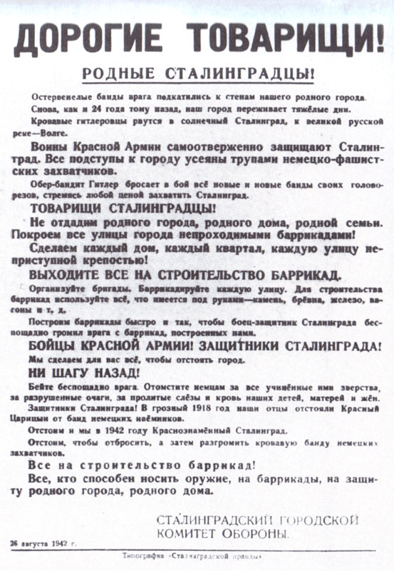 «Дорогие товарищи! Родные сталинградцы! Снова, как и 24 года назад, наш город переживает тяжелые дни. Кровавые гитлеровцы рвутся в солнечный Сталинград к великой русской реке Волге. Сталинградцы! Не отдадим родного города на поругание немцам. Встанем все как один на защиту любимого города, родного дома, родной семьи. Покроем все улицы непроходимыми баррикадами. Сделаем каждый дом, каждый квартал, каждую улицу непреступной крепостью. Выходите все на строительство баррикад. Баррикадируйте каждую улицу. В грозный 1918 год наши отцы отстояли Царицын. Отстоим и мы в 1942 году Краснознаменный Сталинград!