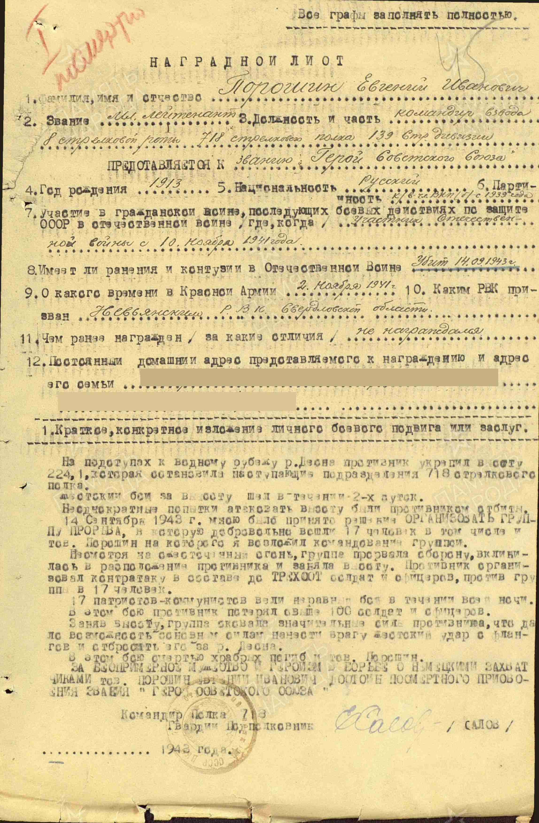 В 718-й стрелковый полк младший лейтенант Порошин прибыл, когда наши прорывались к р. Снопоть.