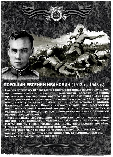 В ходе Смоленской наступательной операции советских войск осенью 1943 года, в полосе наступления 139-й стрелковой дивизии (10-я Армия) путь советским воинам к реке Десна и городу Рославль преграждала господствующая над всей местностью, сильно укрепленная высота 224,1. Она была укреплена тремя рядами траншей, густо усеянная пулеметными гнездами, двумя танками, самоходной установкой «скрипач». Окруженная минными полями, высота занимала важное стратегическое положение и представлялась неприступной. Многочисленные попытки 718-го полка подполковника Е. Г. Салова овладеть опорным пунктом врага успеха не принесли. Было принято решение создать штурмовую группу и возложить на нее выполнение этой задачи. Добровольцев оказалось много. Выбрали взвод уральца младшего лейтенанта Е. И. Порошина, который в прошедших боях уже отличился.