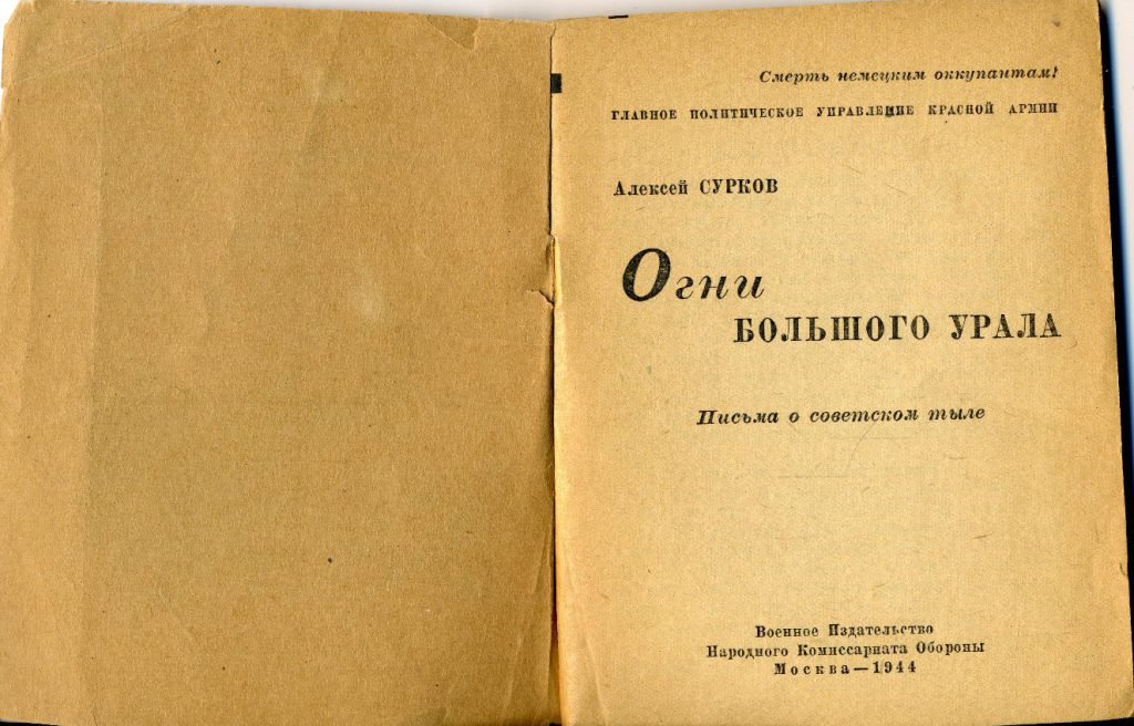 В начале сентября 1944 года вышла в свет книга очерков Алексей Суркова «Огни Большого Урала». В книгу вошли очерки «Железный поток», «Люди завода», «Вторая молодость», «Великое в малом», «Молодой чугун».