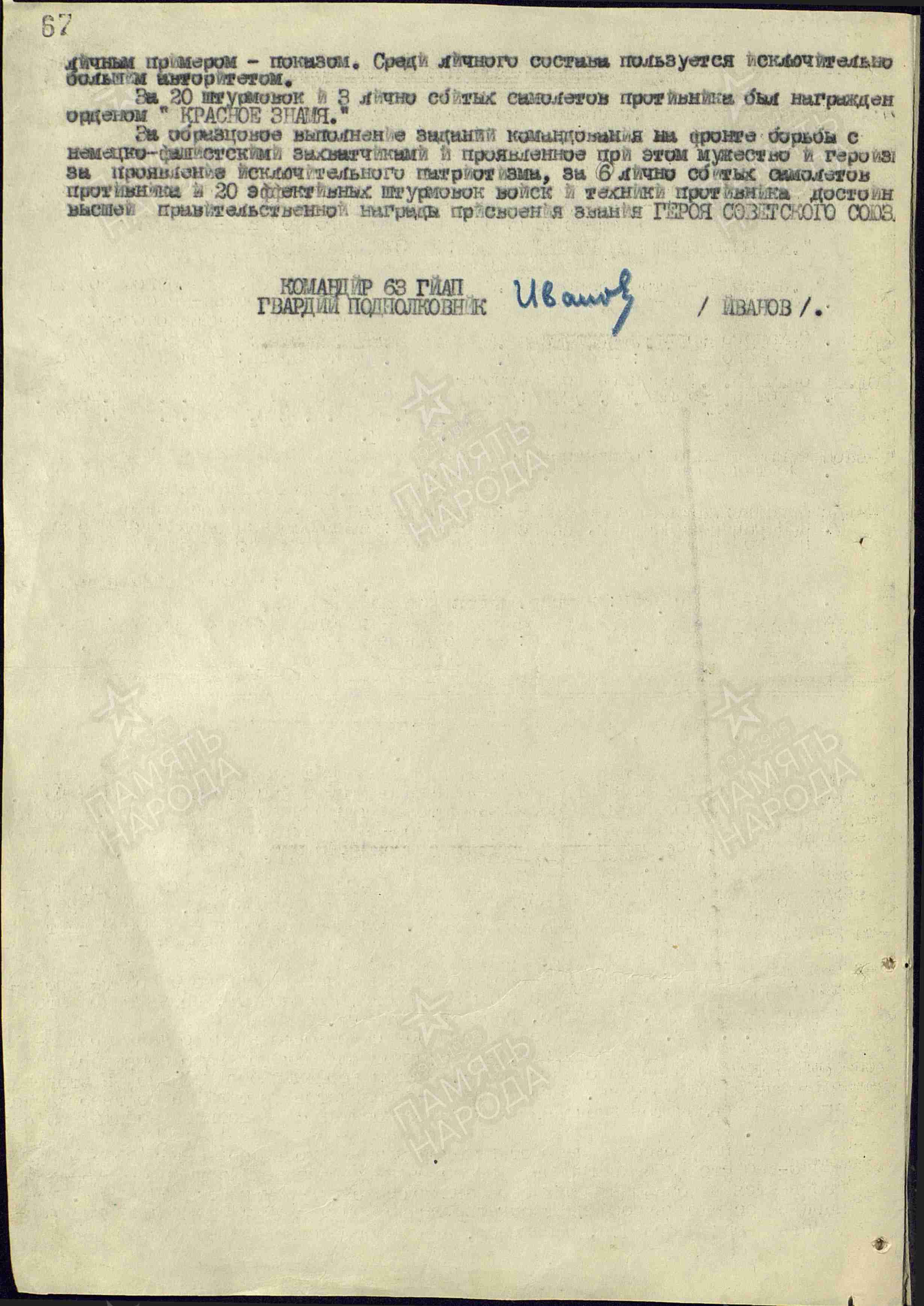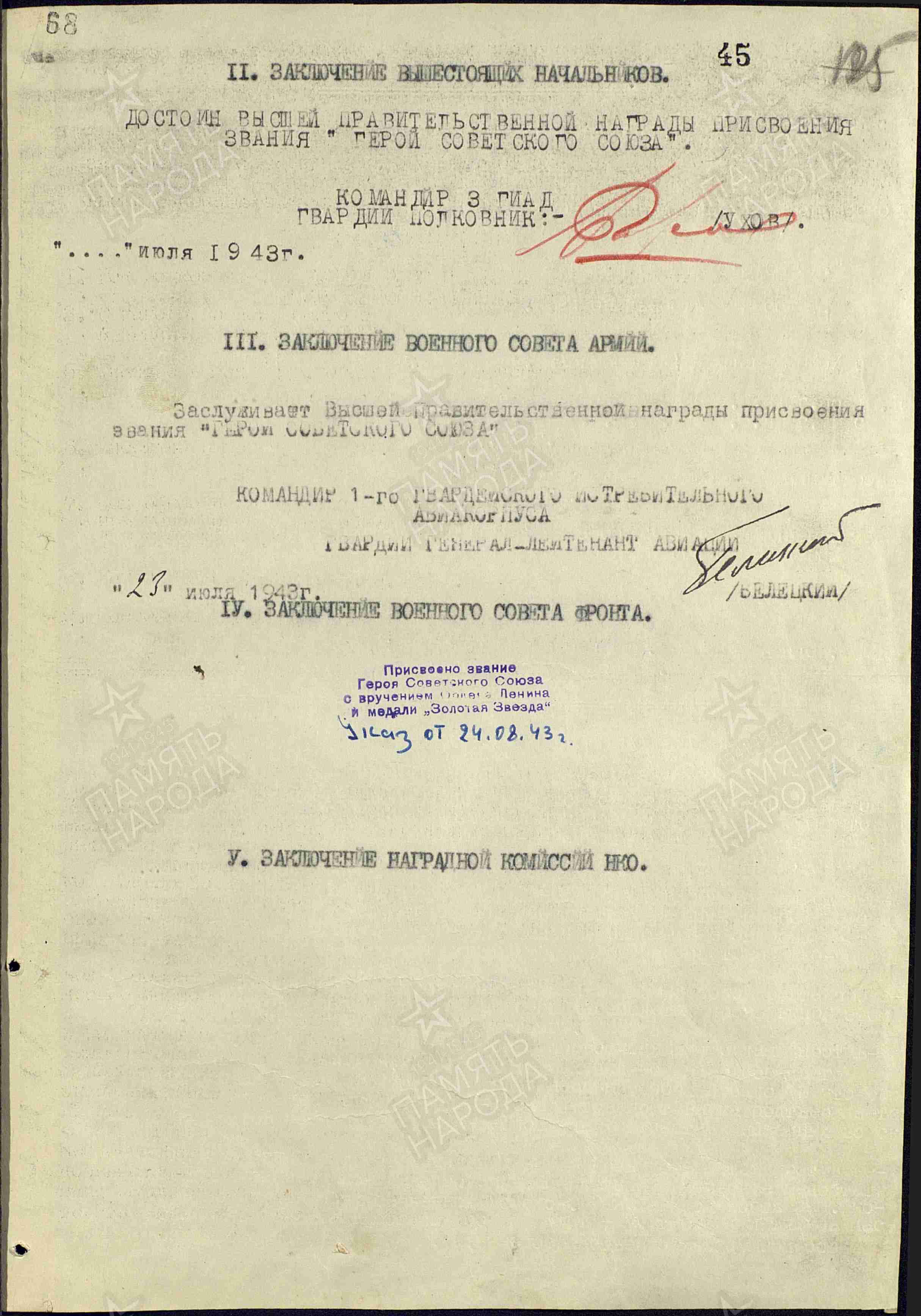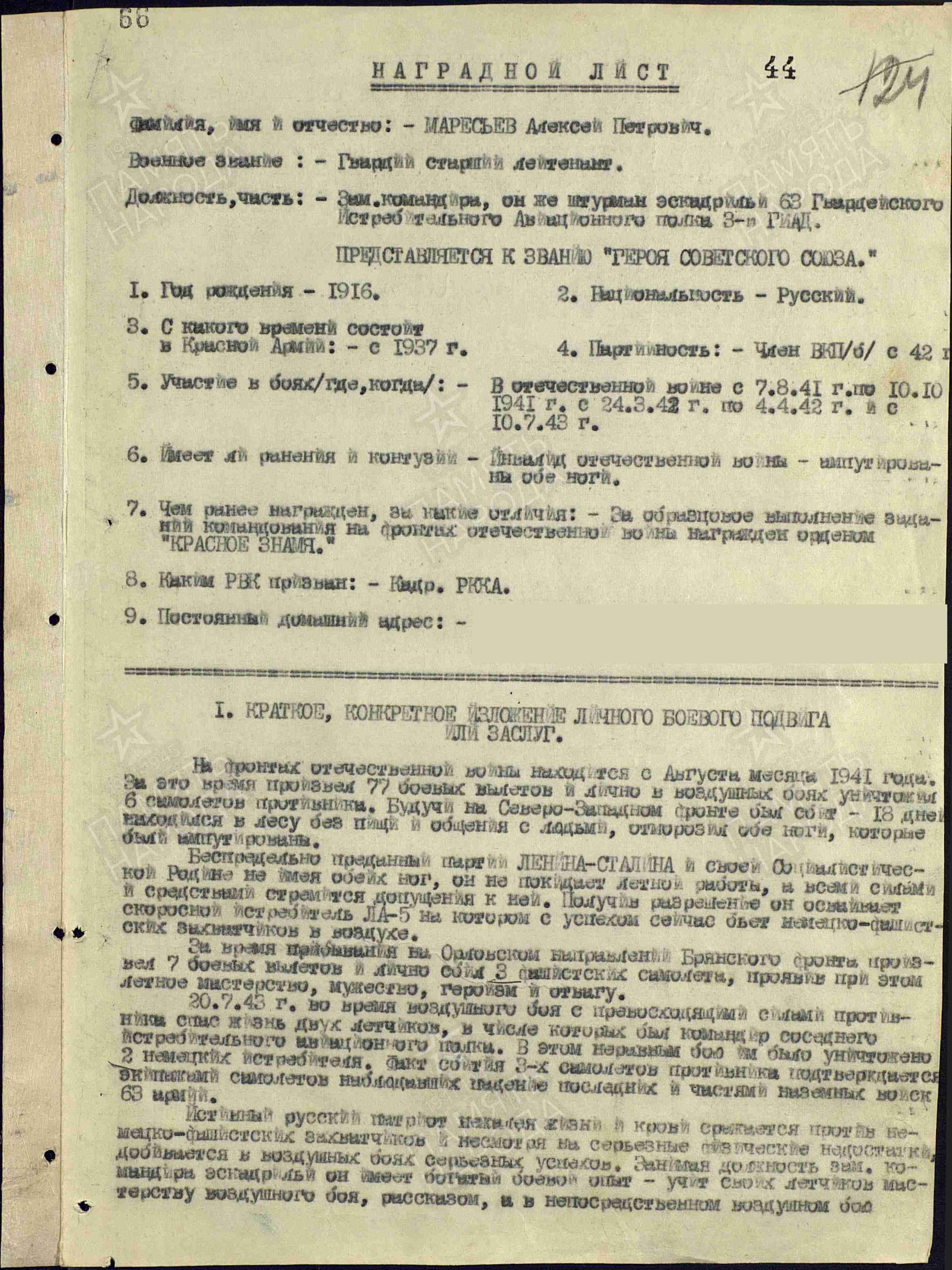 24 августа 1943 года заместитель командира эскадрильи 63-го гвардейского истребительного авиационного полка 3-й гвардейской истребительной авиационной дивизии 1-го гвардейского истребительного авиационного корпуса 15-ой Воздушной армии старший лейтенант Алексей Петрович Маресьев был удостоен звания Героя Советского Союза (Золотая Звезда № 1102).