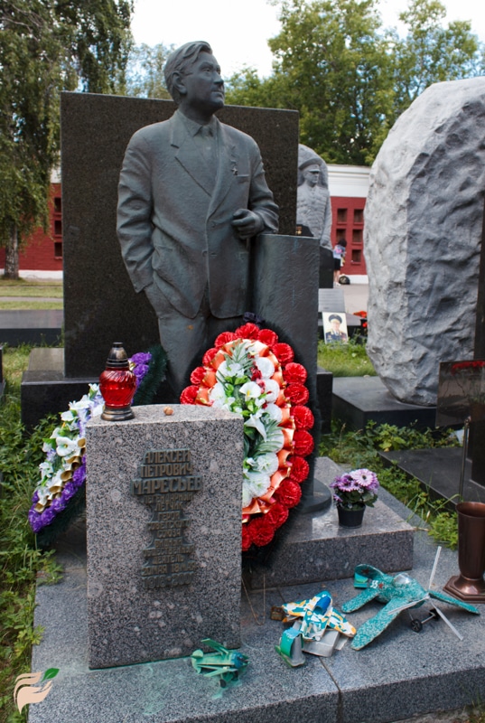 Алексей Петрович Маресьев был похоронен в Москве на Новодевичьем кладбище, где 23 февраля 2005 года в торжественной обстановке был открыт памятник.
