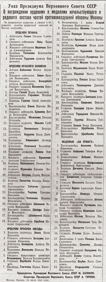 В Указе Президиума Верховного Совета от 24 июля 1941 г. 81 защитник неба Москвы был отмечен государственными наградами, в том числе пять из них награждены орденами Ленина. Среди особо отличившихся: зенитчики – командиры батарей старший лейтенант И.В. Клец, лейтенанты А.Е. Турукало и С.Ф. Осалюк ; летчики 11-го истребительного авиаполка – капитан К.Н. Титенков, лейтенант С.С. Гошко и младший лейтенант П.А. Мазепин.